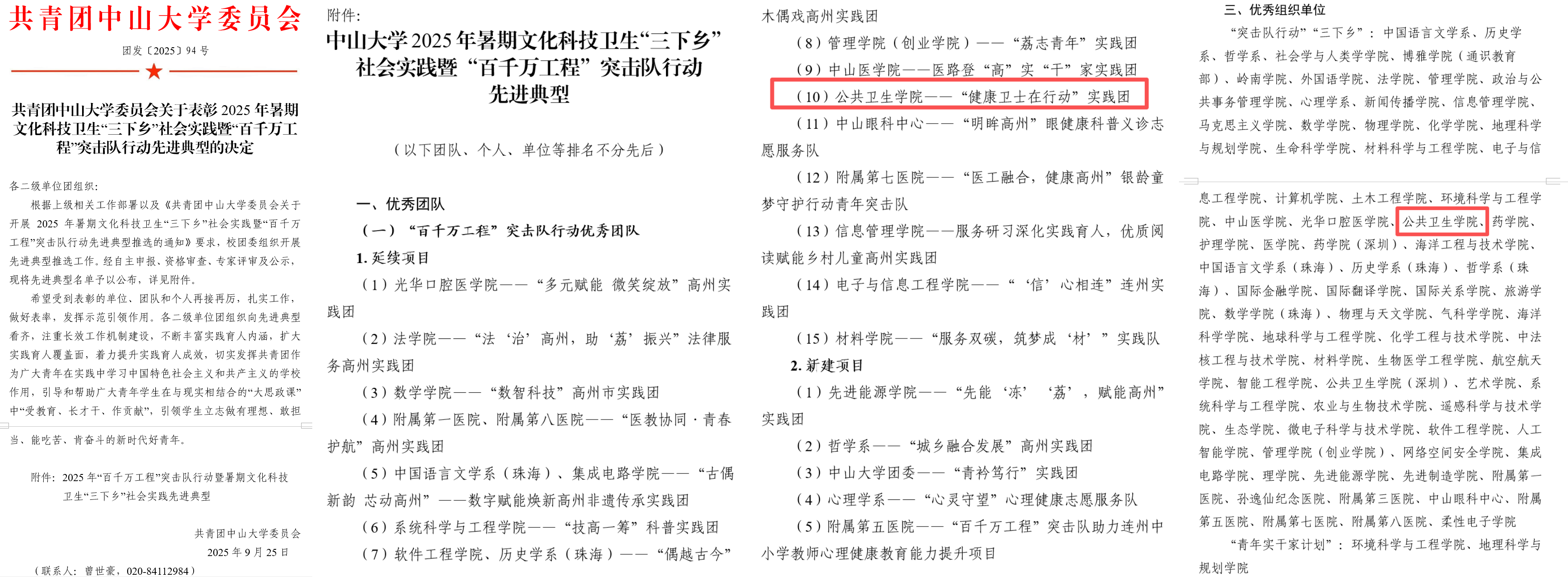 近日,共青团中山大学委员会印发《共青团中山大学委员会关于表彰 2025 年暑期文化科技卫生 “三下乡” 社会实践暨 “百千万工程” 突击队行动先进典型的决定》(团发〔2025〕94 号),老虎机线上凭借在实践育人领域的深耕细作与突出成效,一举斩获“百千万工程”突击队行动优秀团队和“突击队行动”“三下乡”优秀组织单位两项重要荣誉,党政专职辅导员李永强老师、2024级流行病与卫生统计学硕士郑蔓琪同学荣获“优秀个人”,再度彰显了中大公卫人扎根基层、服务民生的责任担当,为老虎机线上