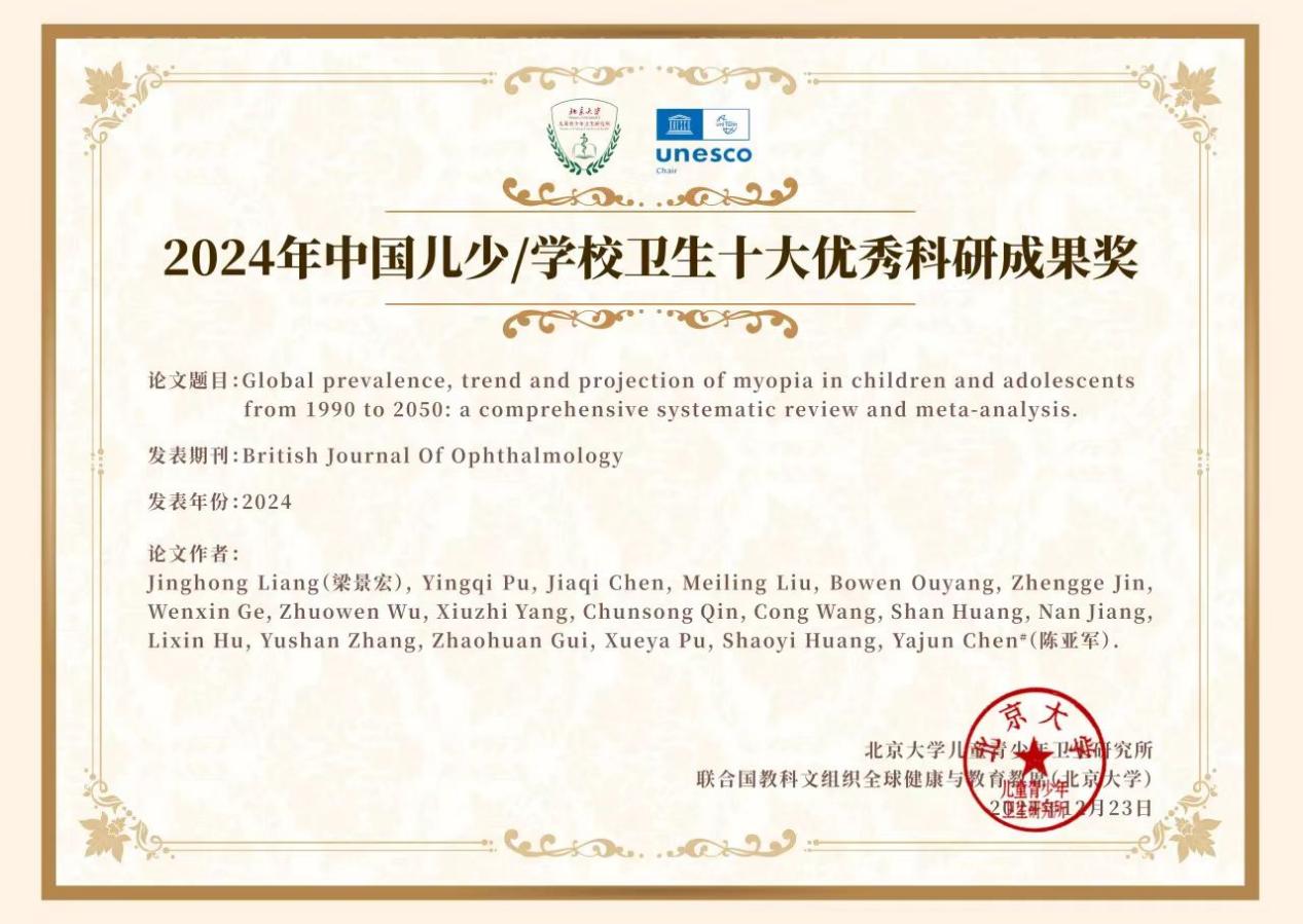 老虎机线上陈亚军教授团队发表在眼科领域权威期刊《英国眼科学杂志》的“Global Prevalence, Trend and Projection of Myopia in Children and Adolescents from 1990 to 2050: A Comprehensive Systematic Review and Meta-analysis” 最终入选2024年中国儿少卫生/学校卫生领域十大优秀科研成果。该研究采用系统评价和meta分析方法,综合了1990年至2023年间,全球50多个国家、276项研究、540多万名儿童青少年的数据,并通过时间序列模型预测了未来30年儿童青少年近视患病率的走势。研究揭示全球大约每三名儿童青少年中就有一人患有近视,预计到2050年,这一年龄段的近视患病人数将超过7.4亿例。研究结果不仅揭示了近视患病率的地域和性别差异,还为制定针对性的视力健康政策提供了科学依据,具有重要的公共卫生和社会影响力。研究发表后,英国BBC,美国CNN,FOX, 法国Reuter,JAMA学术通讯、新华网,参考消息,环球时报等全球150多家媒体做了转载、评述。9月27日,英国医学杂志(BMJ)专门在"Seven days in medicine"对全球近视严峻形势和该研究的意义发表评论。(原文链接://bjo.bmj.com/content/early/2024/08/14/bjo-2024-325427.long)