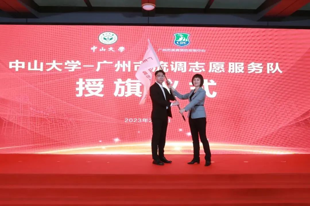 赖志鸿副市长、张屹副主任、张周斌书记,中山大学校长办公室主任杨建林、研究生院院长陈曾平、夏敏院长共同为“中山大学-广州市疾病预防控制中心高水平公共卫生人才培养示范基地”揭牌。随后,张屹副主任为中山大学-广州市流调志愿服务队授旗。