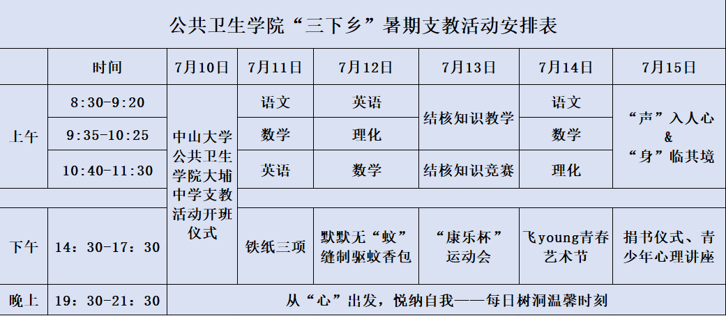 支教团制定了周密的支教计划、安排了丰富多彩的课程。于每日上午开展语、数、英、理、化基础教育,下午举办专题教育以及各类活动。