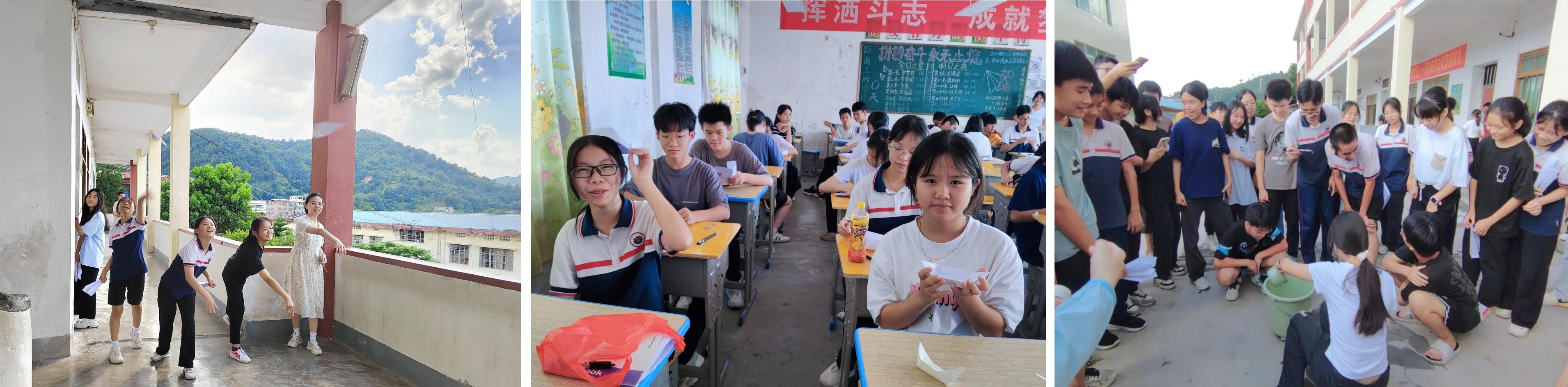 支教小老师与同学们进行纸飞机比赛(左);同学们展示各种类型的纸船(中);开展纸桥承重比赛(右)