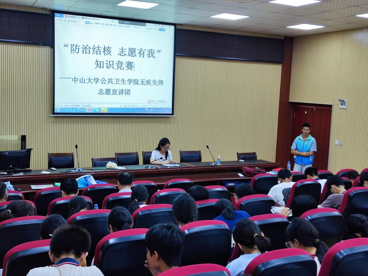 支教团成员同时是入选2023年全国大学生“防治结核 志愿有我”志愿宣讲团的无疾先锋志愿宣讲团成员,他们充分发挥预防医学专业优势,根据大埔中学同学们的传染病知识的水平,提前准备防治结核相关资料,开展了具有针对性的防治结核知识讲座,并在讲座结束后进行防治结核知识竞赛,通过生动的讲解和紧张的知识竞赛强化防治结核宣传效果。