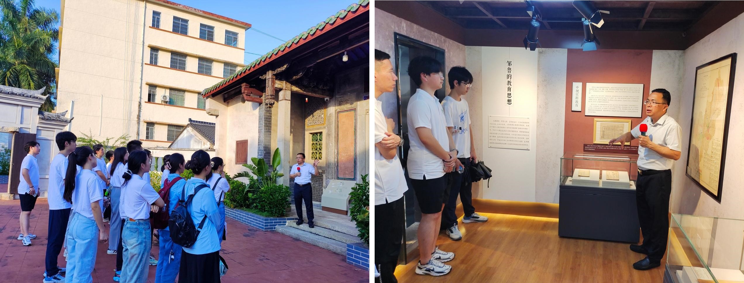 支教团成员在赖校长的带领下参观邹鲁故居(左);赖校长为支教团讲解邹鲁先生事迹(右)