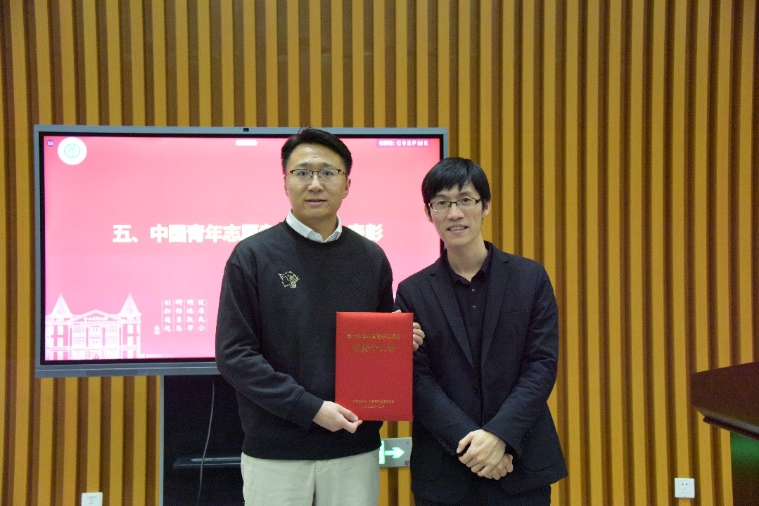 学校团委副书记林炜双(右)为王胜浩同学(左)颁奖