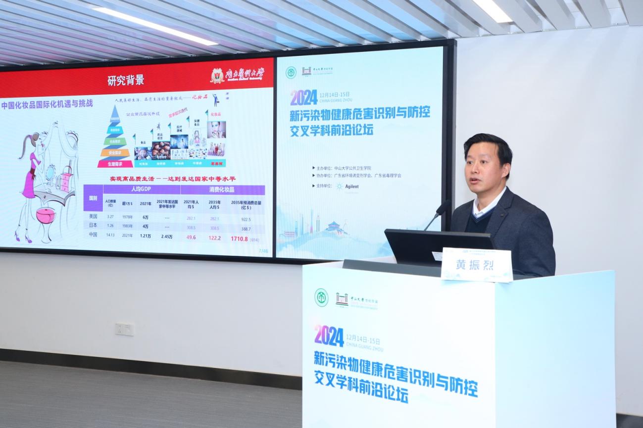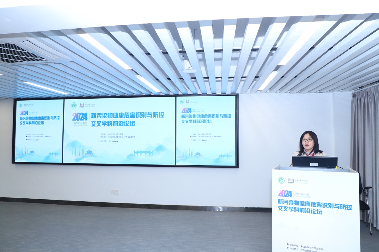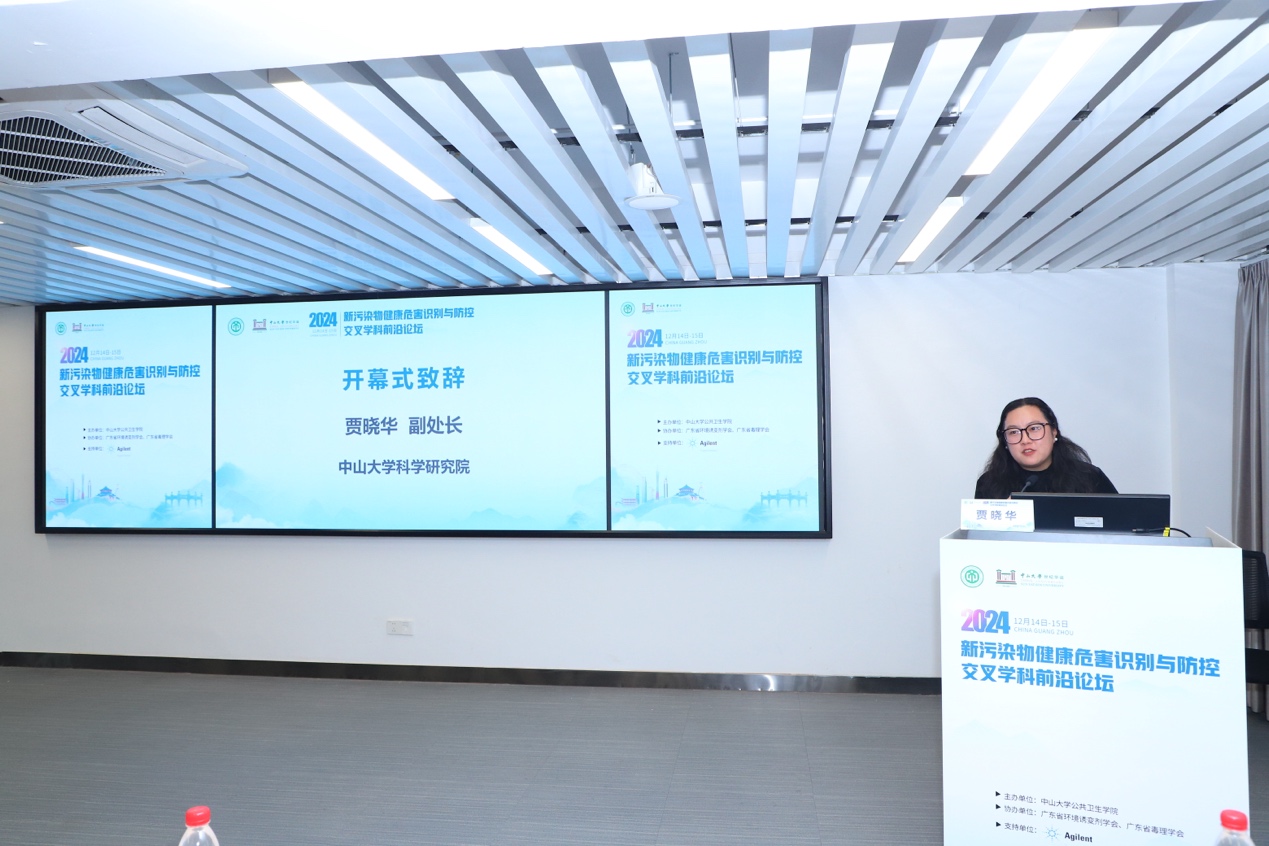 高质量发展的核心引擎,今年适逢中大百年华诞的重要时刻,为积极响应新污染物治理国家重大战略,积极筹备此次论坛,汇聚智慧,启迪新思,共同探讨新污染物防控的有效路径。中山大学科学研究院纵向处贾晓华副处长作开幕致辞,她特别指出新污染物对全球生命健康的严峻挑战,党的二十大报告中明确提出要“深入推进环境污染治理”“提升生态系统多样性、稳定性和持续性”。此次论坛的召开正是响应国家政策、解决实际问题的重要学术行动,希望以此为契机促进学科融合,拓宽学术视野,推动公共卫生与预防医学领域取得更多突破性进展,为“健康中国”“美丽中国”的建设提供有力支撑。
