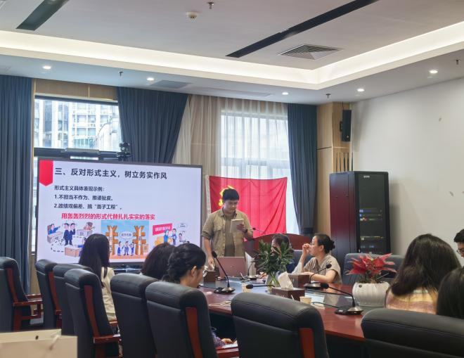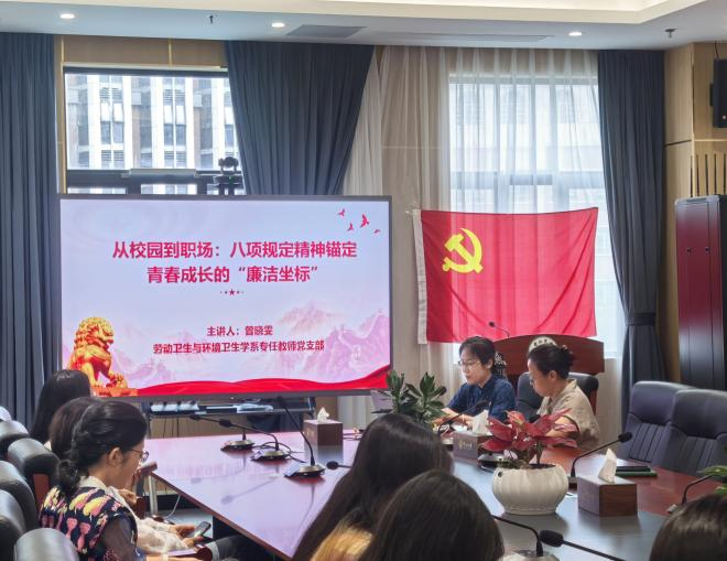 活动伊始,专任教师党支部书记曾晓雯教授以“从校园到职场:八项规定精神锚定青春成长的廉洁坐标”为题,系统梳理中央八项规定的发展历程,深刻阐释新时代廉洁自律的内涵要求。此外,曾教授还围绕两个顶风违规吃喝案例进行了警示教育。研究生党支部书记陈诺同志则围绕“树立务实作风,做人民好公仆”主题,强调树立务实工作作风以及密切联系群众的实践路径的重要性。两位书记的党课内容丰富、深入浅出,让大家深受启发。