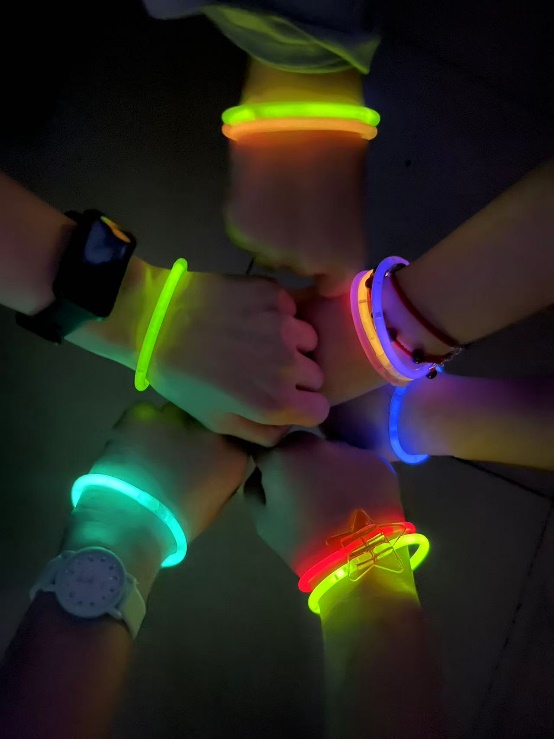在北校园操场开启“心光跃动”荧光夜跑。数十名同学佩戴荧光棒,用脚步丈量夜色,从起点到终点,每一圈都是压力的释放,每一次打卡都是坚持的勋章。在“荧光吐槽会”摊位,同学们匿名写下烦恼,用气球爆破仪式告别焦虑。气球炸裂的瞬间,谱写成笑声与解脱的交响曲;“荧光创绘”摊位前,同学们将荧光棒扭成星星、爱心和小人。光影交织中,团队合作的作品是夜的艺术,是彼此心灵的联结,更是青春的光谱!