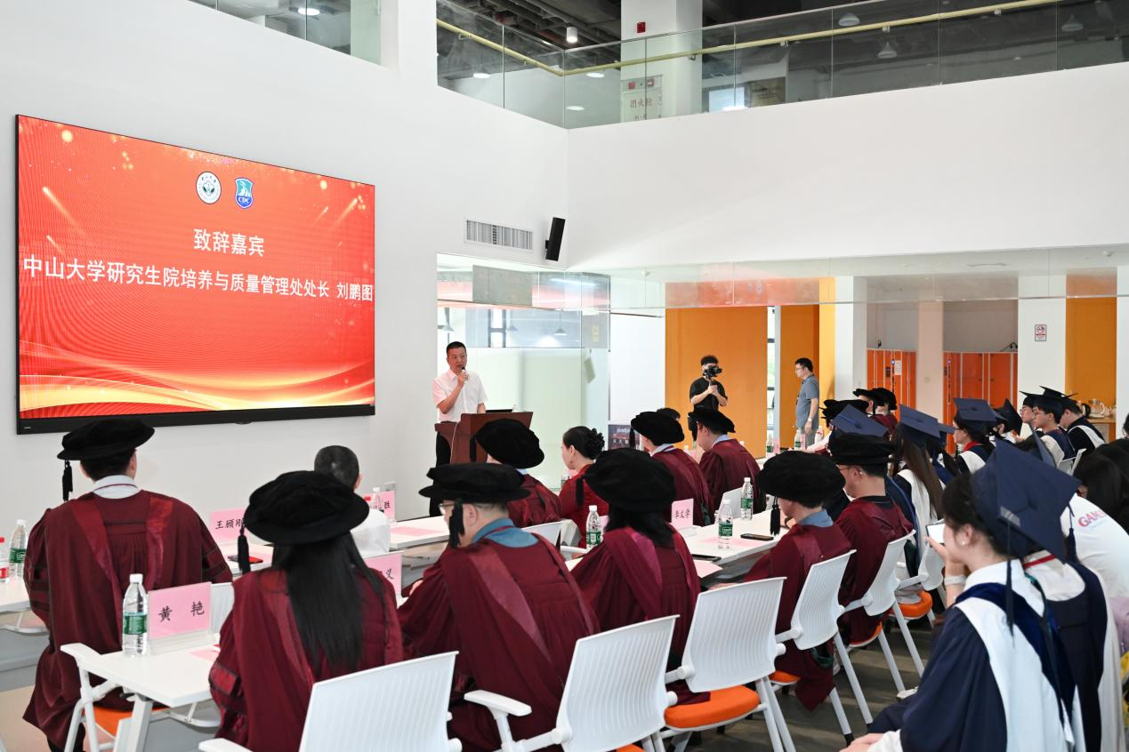 院长夏敏、广州市疾控中心党委书记张周斌等领导出席仪式并致辞。刘鹏图代表学校对首届实验班14名毕业生致以诚挚的祝福和祝贺,对老师们的辛勤培养表示衷心的感谢。同时,他强调,实验班是中山大学推进公共卫生教育改革的重要成果,体现了“医学、预防、管理”融合的复合型人才培养理念,呼应了国家构建强大公共卫生体系的战略需求。夏敏回顾了三栖班同学们三年来的成长历程,并寄语毕业生“勇担时代重任、坚持终身学习、践行中大精神”,在守护人民健康的事业中绽放青春。张周斌希望同学们能够牢记“医防管”三栖人才的使命与责任,为守护人民健康贡献自己的智慧和力量。他期待未来与中山大学的合作能够迈向更高的台阶。