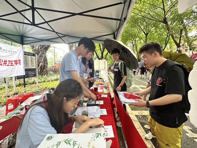 迎新摊位精心制作了“‘预’你同行,‘卫’你而来”新生照片墙,将42名公卫新生照片组合为“公卫”二字,新生报到时可以找到自己照片,在照片上贴上院徽并签上自己的姓名,从入学就种下集体团结的种子。