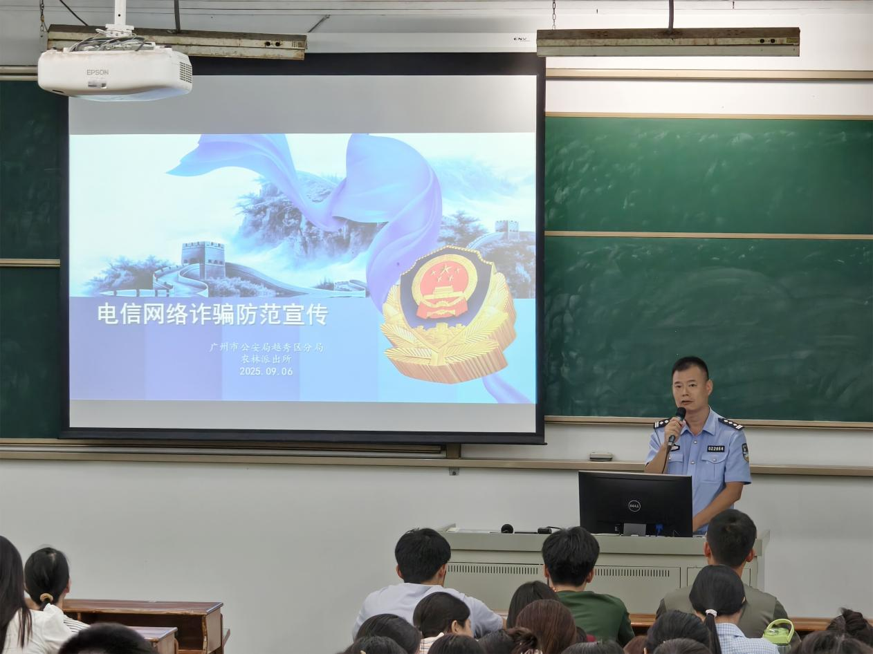 9月11日晚,老虎机线上 邀请了中山大学党委保卫部梁瑜老师和农林街派出所曾杰星警官面向新生开展校园安全和电信网络反诈宣传讲座。