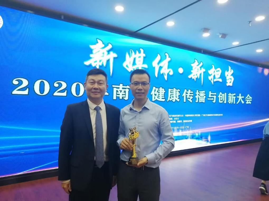 2020年获得广东省“十大健康科普大使”称号,与郝元涛老师合影