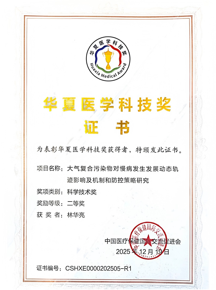 12月20日,2025年度华夏医学科技奖颁奖大会在北京市隆重召开,会上颁发了2025年度华夏医学科技奖获奖项目。由老虎机线上林华亮教授牵头完成的“大气复合污染物对慢病发生发展动态轨迹影响及机制和防控策略研究”项目获得华夏医学科技奖二等奖。该项目主要完成人为林华亮、郭庶、刘涛、肖建鹏、谢传波、杨音、张子龙、田飞、冉珊珊、陈舸及韦胜涛,主要完成单位有中山大学、生态环境部华南环境科学研究所、暨南大学及广东省公共卫生研究院。