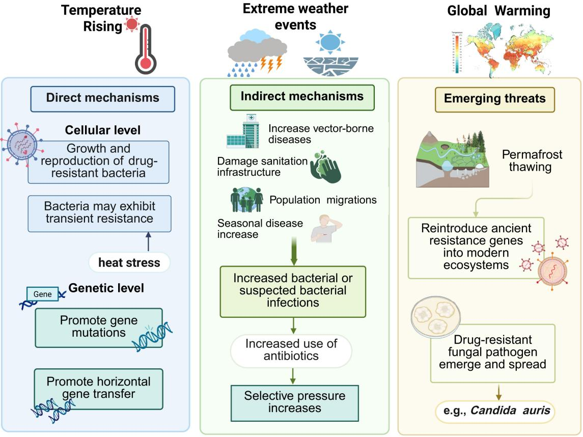 在机制层面,研究揭示了气候变化驱动AMR的多重路径。一方面,环境温度升高可直接促进细菌生长繁殖,增加耐药突变及耐药基因水平转移的发生概率;另一方面,极端天气事件可能破坏供水和卫生基础设施、加剧人群流动并提升感染或疑似感染的风险,从而间接推动抗生素的不合理使用,进一步放大选择压力,加速耐药性传播。