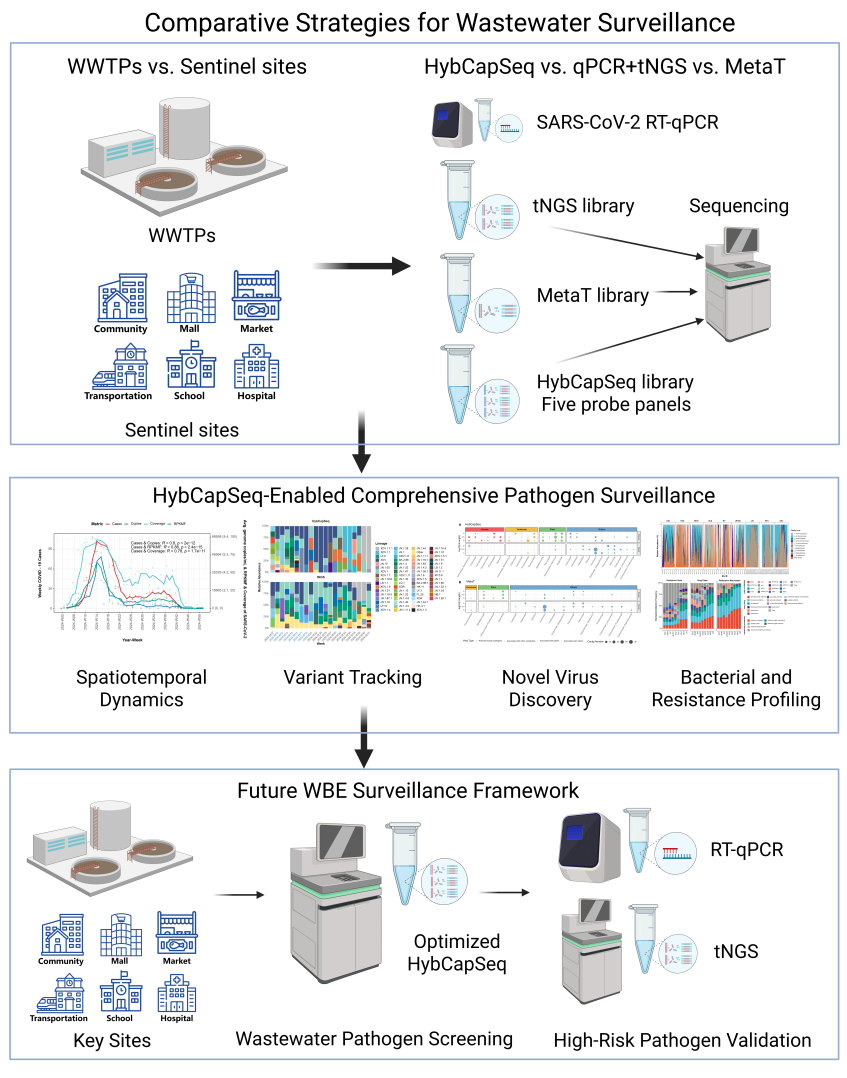 首项研究中,团队在广州和南宁开展为期一年的纵向污水监测研究,覆盖污水处理厂和多个重点公共场所的污水样本,系统比较了污水杂交捕获测序(HybCapSeq)与多种传统分子检测技术在污水监测中的性能。